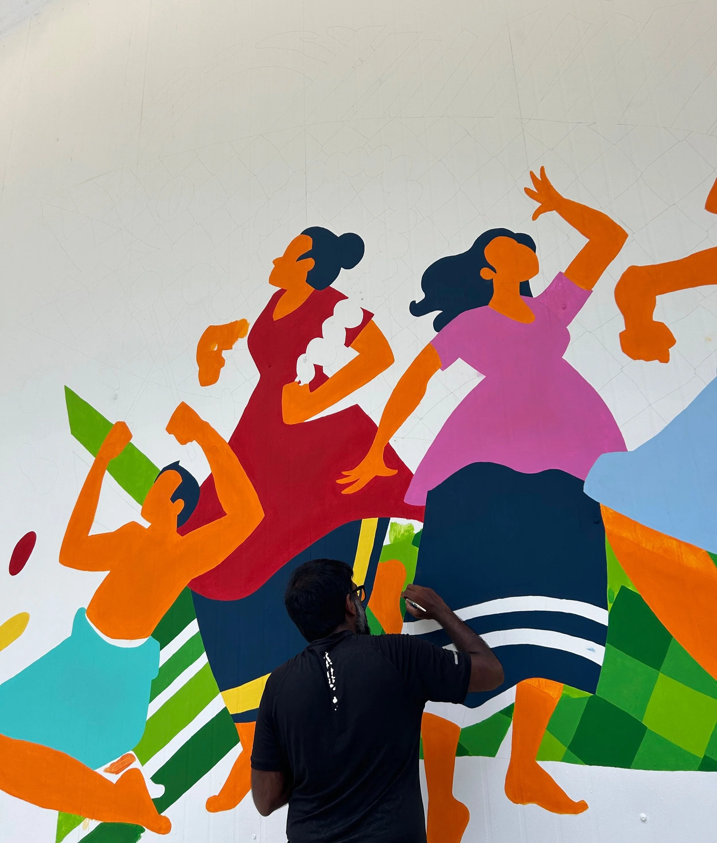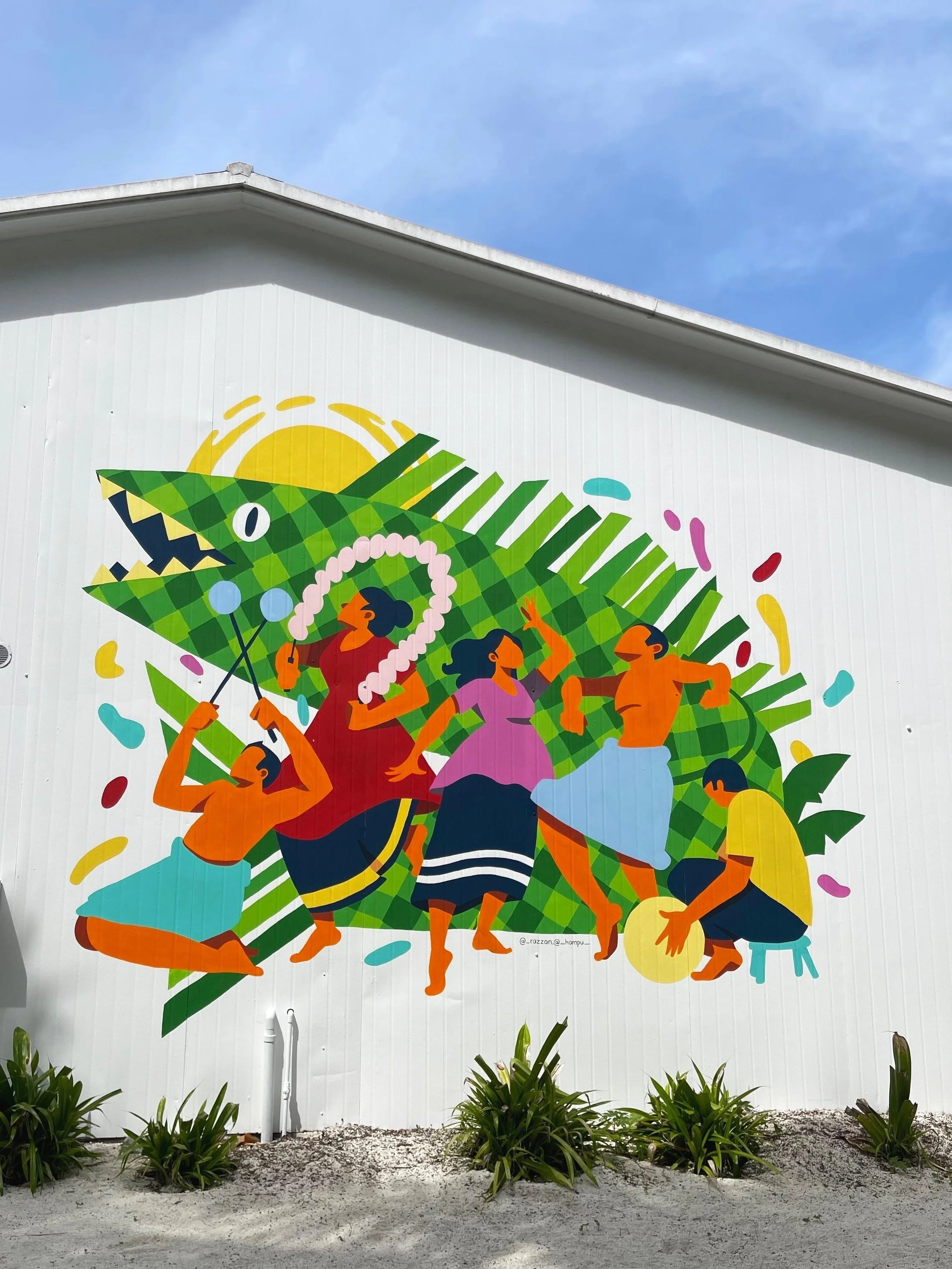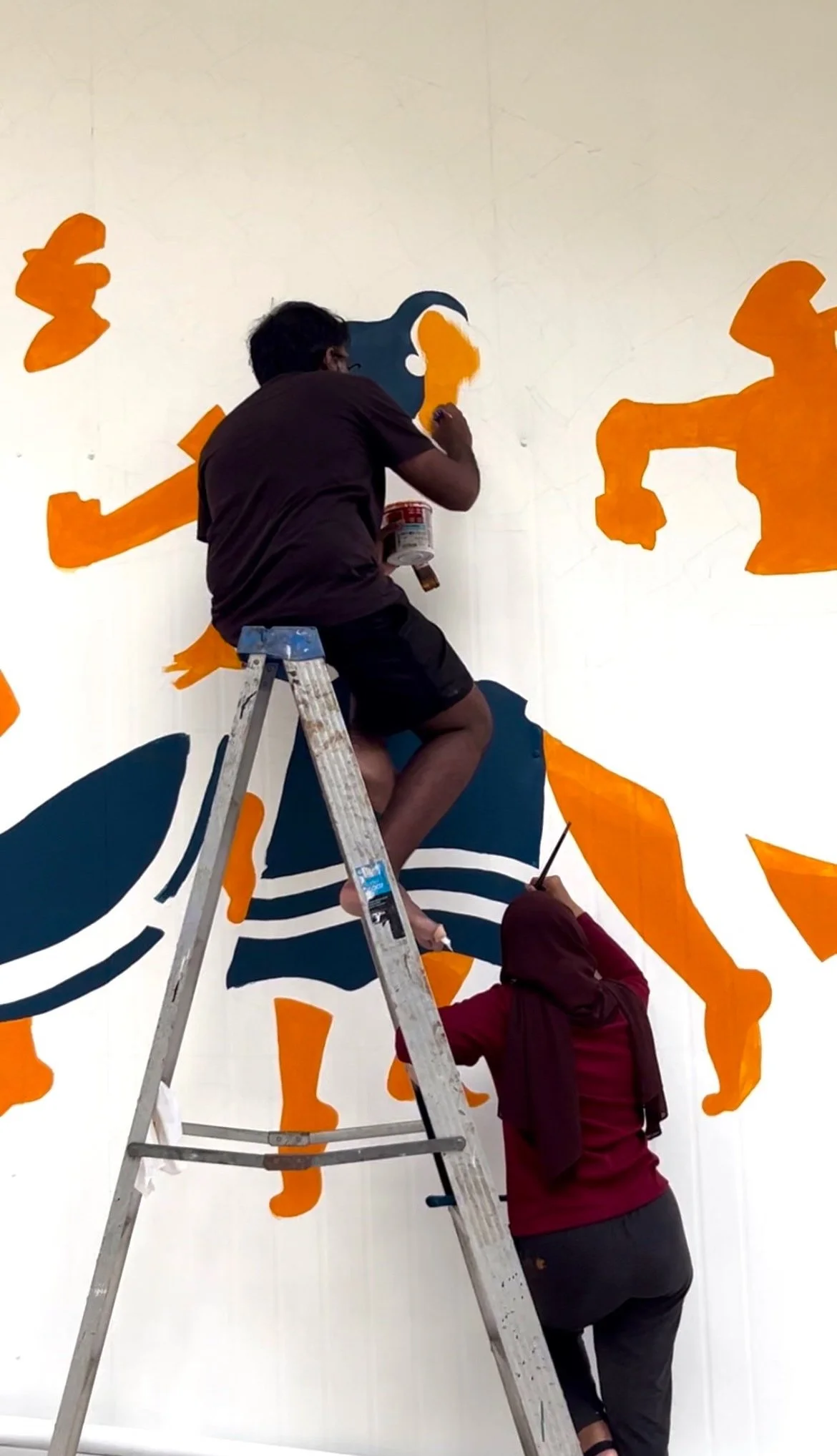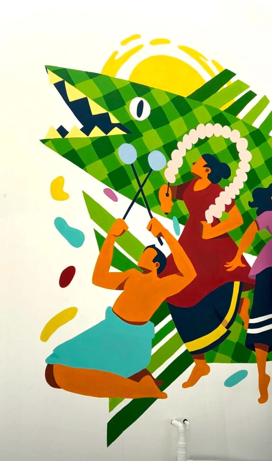 This mural was painted at Oaga Resort Maldives for their Kula Kula Festival. It captures the tradition of celebrating Eid in Maldives in which traditional dances such as Boduberu and Dhandi Jehun are performed in traditional clothes. It also showcases the famous Bodumas which is part of a tradition based on an ancient folklore.